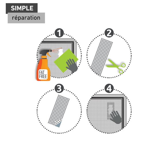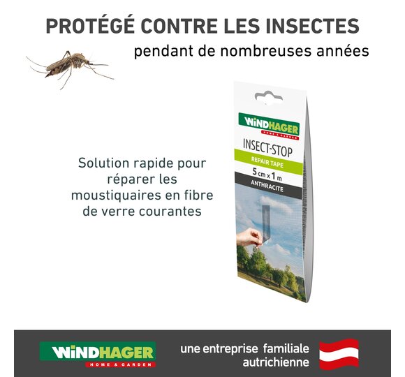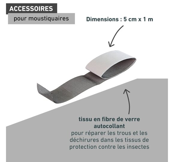 Plutôt que de laisser s’agrandir les dégâts dans la toile en fibre de verre, le ruban de réparation constitue une solution rapide. Collez simplement sur la déchirure ou le trou et le mal est déjà réparé.