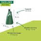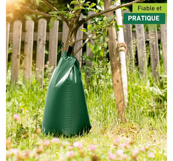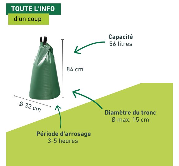 - 2 modèles disponibles : 56 litres (diamètre de tronc max. 15 cm, durée d’arrosage 3 – 5 heures) et 95 litres (diamètre de tronc max. 18 cm, durée d’arrosage 8 – 12 heures)