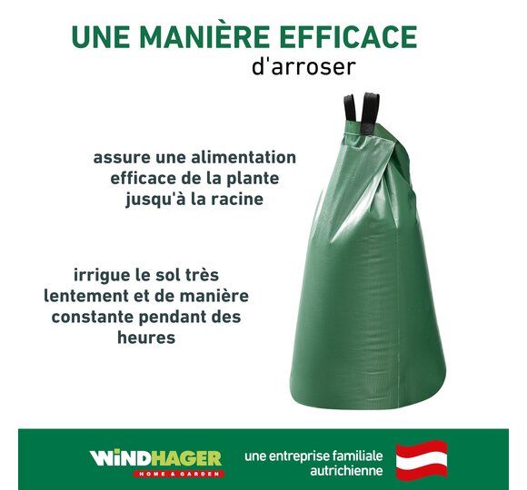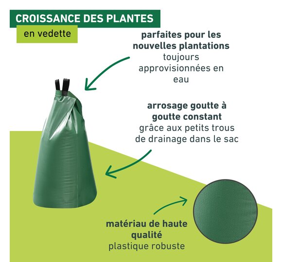 L’irrigation joue un rôle déterminant pour la santé et la croissance réussie de l’arbre. Les jeunes arbres notamment profitent d’une alimentation optimale. Si trop d’eau est alimentée trop abondamment en une fois dans la terre, il existe le risque qu’elle s’écoule sur la surface et qu’elle ne s’infiltre pas jusque vers les racines. En revanche, la micro-irrigation par trous de drainage dans un sac irrigue très lentement et constamment le sol pendant des heures : 3-5 heures pour la variante de 56 litres, 8-12 heures pour la variante de 95 litres. La plante est ainsi alimentée efficacement.