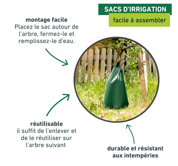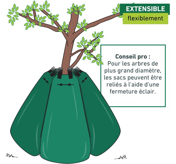 - pour des arbres plus grands ou des besoins en eau accrus, les sacs peuvent être reliés entre eux par la fermeture éclair
