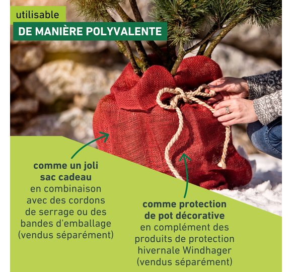 Toile naturelle décorative pour protéger les plantes du froid, du vent et de la neige. Protège les arbustes, les rosiers et les plantes en pot en période de froid. Également utilisable comme sac de rangement pour les pommes de terre, les oignons, etc. ou comme emballage cadeau.