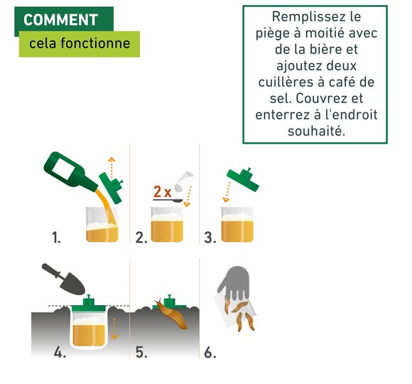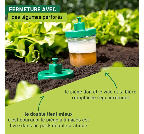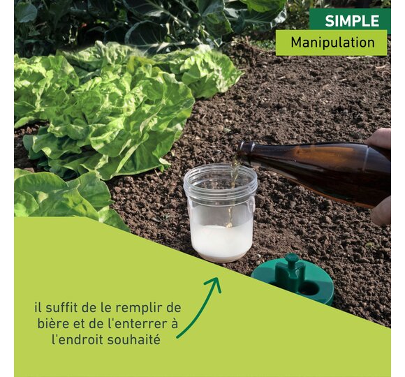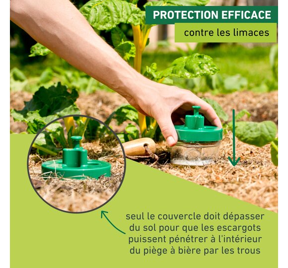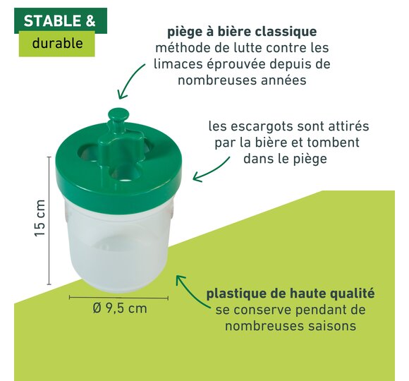 Très simple à utiliser : remplir de bière, fermer le couvercle et placer le piège. Les limaces sont attirées par l’odeur de l’appât, tombent dans le piège et peuvent ainsi être enlevées sans problème. Renouveler l’appât en cas de besoin. Dès la première utilisation, ces nuisibles « insatiables » tombent dans le piège et vos jolies plantes restent intactes.