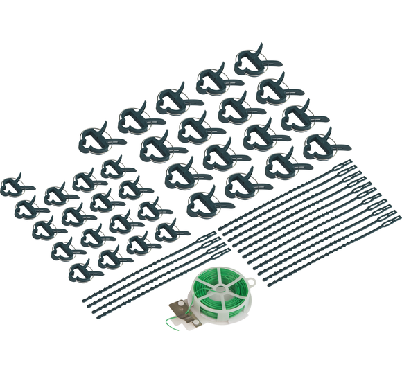 - contenu : 1 rouleau de fil de liage avec dispositif de coupe, 17 clips de plantes grands et 17 clips de plantes petits, 15 liants universels