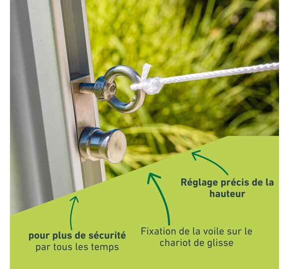 - INSTALLATION FACILE – Fixation de la voile sur chariot coulissant (douille à sceller/support de terrasse vendu séparément)