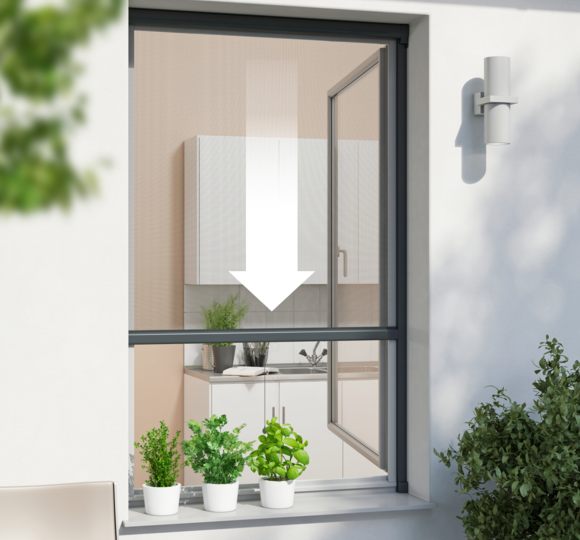 Nos moustiquaires sont également disponibles avec une toile de protection solaire qui offre un double avantage : non seulement elle éloigne les insectes gênants, mais elle réduit également le rayonnement solaire et contribue ainsi à garder vos pièces agréablement fraîches les jours de grande chaleur. Elle s’ouvre et se referme en un éclair, selon vos besoins.