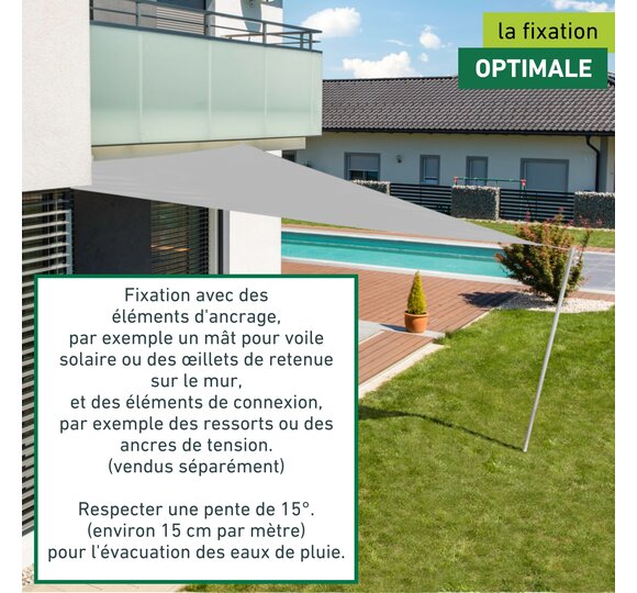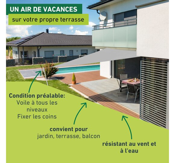 Disponibles en différentes couleurs et formes, vous trouverez ici une large gamme de voiles d'ombrage. Elles sont fabriquées en HDPE, qui laisse passer l'air et l'eau, ce qui évite l'accumulation de chaleur, ou en toile de polyester enduite, qui résiste au vent, à l'eau et aux salissures. Des kits de montage spéciaux et de nombreux accessoires permettent une installation personnalisée et une utilisation confortable de la voile d'ombrage.