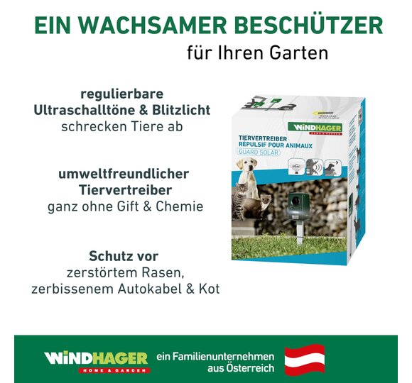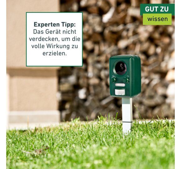 Les intrus à quatre pattes sont chassés et éloignés durablement de votre propriété grâce aux ultrasons et au flash lumineux. Les sons sont à peine perceptibles pour l’homme mais très désagréables pour les intrus à quatre pattes. L’appareil répulsif est résistant aux intempéries pour une protection garantie jour et nuit.