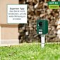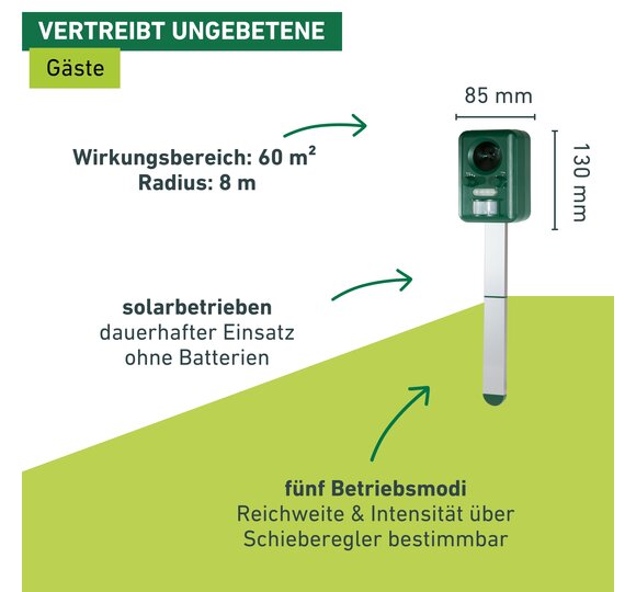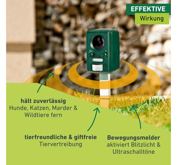 Un appareil répulsif pour chasser écologiquement chiens, chats, martres, ratons laveurs et animaux sauvages. Le gardien de jardin solaire a une portée atteignant 8 m avec un champ de détection de plus 110 ° pour une protection sur une superficie allant jusqu’à 60 m². Les ultrasons à basse fréquence, qui se propagent sous forme d’ondes, sont à peine perceptibles pour l’oreille humaine. En revanche, elles sont horribles pour les animaux importuns qui prennent vite la fuite.
