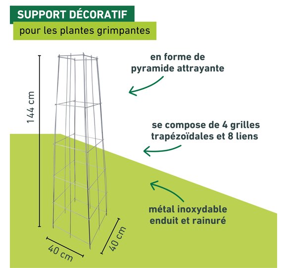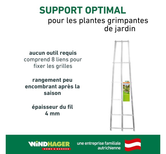 Grâce à un système de montage simple, on peut le monter sans outils : il suffit de clipser 2 liens par bordure. Le tipi est rapide à utiliser et permet la croissance optimale d’une multitude de splendides plantes telles que le lierre, les roses, les clématites ou les légumes.