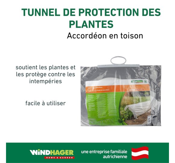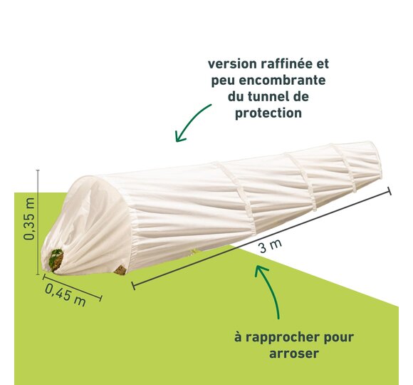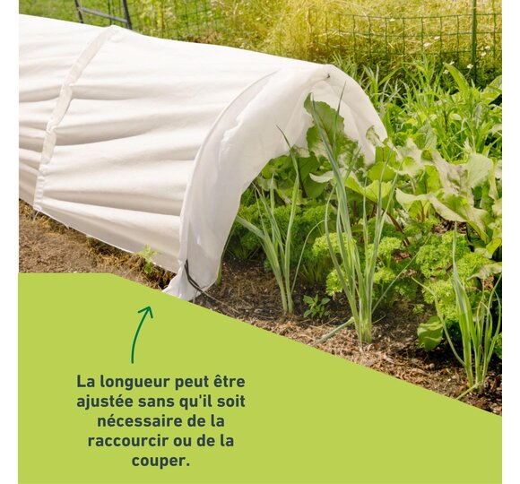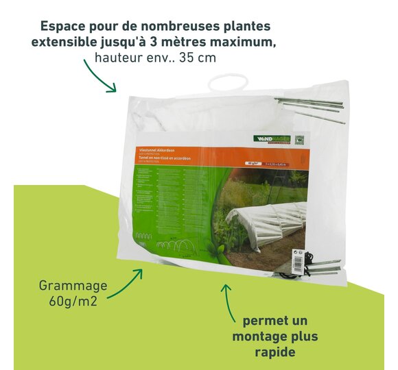 Le tunnel extractible est une version raffinée du tunnel de protection qui vous fait gagner de la place, car vous pouvez en adapter la longueur individuellement sans être obligé de le couper à la bonne longueur ou de le raccourcir. Cela a pour avantage que le montage est plus rapide et que vous pouvez consacrer le temps ainsi gagné à vous occuper de vos plantes. D’autre part, le système Akkordeon permet d’emboîter ensemble le tunnel lorsque vous voulez arroser. Le voile de croissance protège les plantes contre les influences des intempéries.