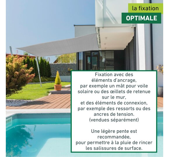 Disponibles en différentes couleurs et formes, vous trouverez ici une large gamme de voiles d'ombrage. Elles sont fabriquées en HDPE, qui laisse passer l'air et l'eau, ce qui évite l'accumulation de chaleur, ou en toile de polyester enduite, qui résiste au vent, à l'eau et aux salissures. Des kits de montage spéciaux et de nombreux accessoires permettent une installation personnalisée et une utilisation confortable de la voile d'ombrage.