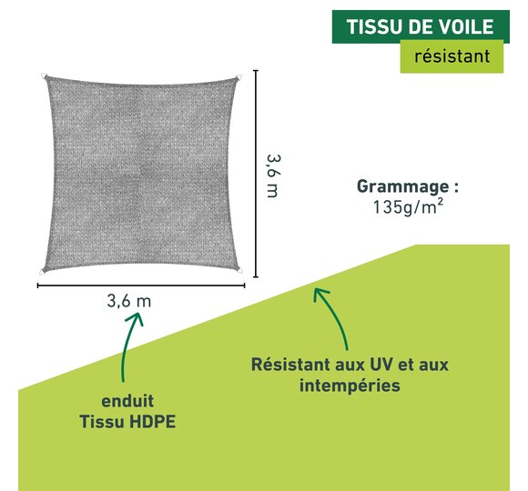10784 Voile d'ombrage Hdpe ELBA carré 3,6x3,6m gris Voir