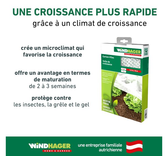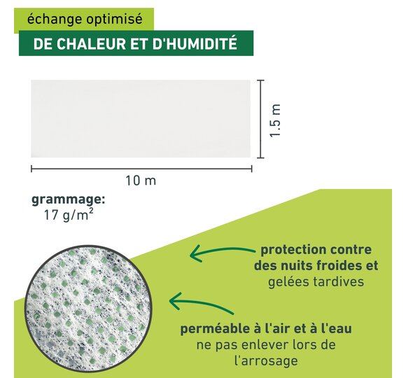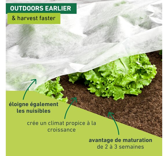 La création d'un microclimat sous le voile favorisant la croissance permet une maturation précoce des jeunes plants de 2 à 3 semaines. Ceci engendre une récolte plus abondante. Protège aussi contre le gel (protection thermique), les insectes, les attaques des animaux et la grêle.