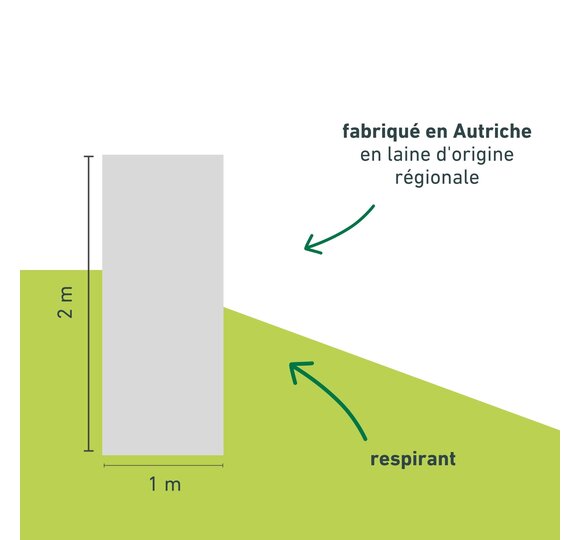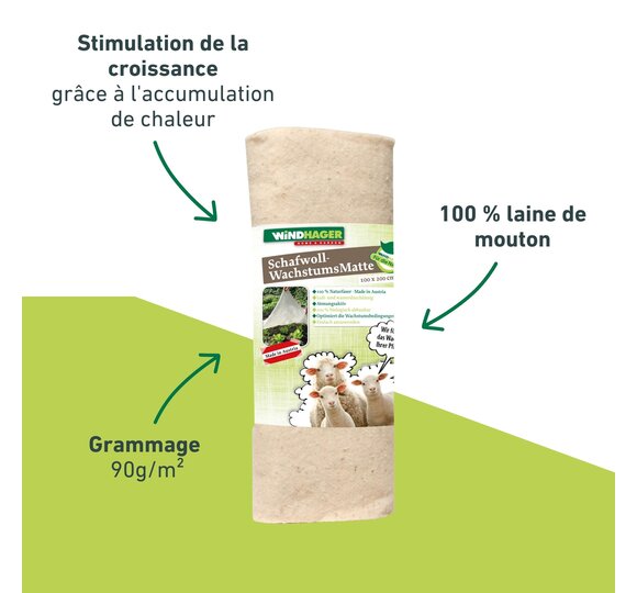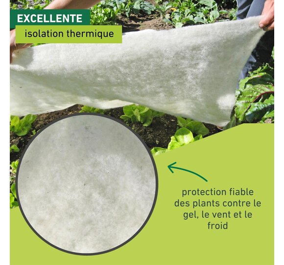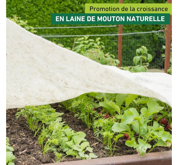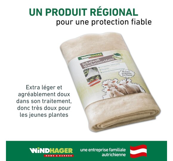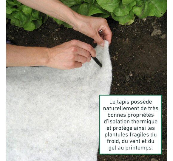Le tapis est naturellement doté d'excellentes propriétés isolantes, ce qui lui permet, au printemps, de protéger les plants fragiles du froid, du vent et du gel. Extrêmement léger et d'une finition agréablement douce, il est particulièrement respectueux des jeunes plants. Fabriqué en Autriche - laine d'origine locale.