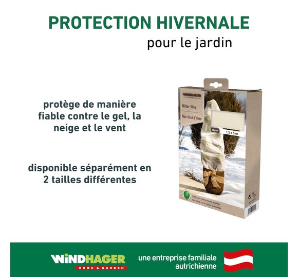 Ce produit de protection hivernale est le bon choix pour tous les amateurs de jardinage qui attachent de l’importance à la durabilité. Il offre en même temps les avantages d’une protection hivernale classique : il est léger et flexible, s’adapte parfaitement et protège vos plantes en hiver contre le froid, le vent et le soleil. La protection hivernale s’enroule rapidement autour des plantes et peut ensuite être fixée à l’aide d’un cordon de serrage, par exemple en jute ou en laine, issu de la gamme Windhager. Le voile d’hivernage a un grammage de 30 g/m² et est disponible en deux dimensions différentes.