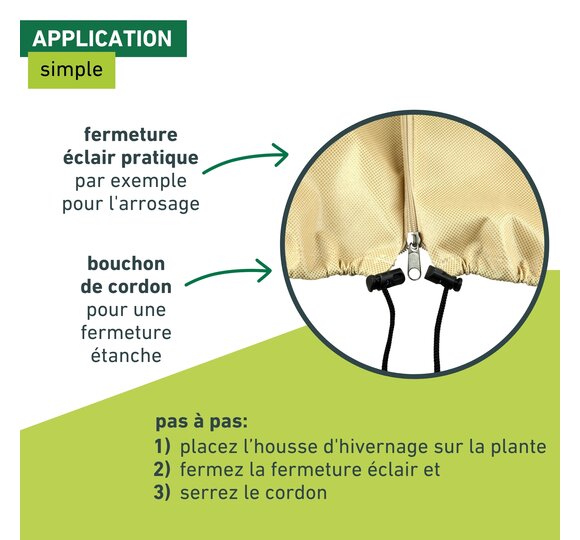 Le maniement de la bâche en non-tissé d’hivernage SUPERPROTECT XXL est un jeu d’enfant. Recouvrir tout simplement la couronne de la plante, tirer sur la fermeture éclair et fermer, si nécessaire, la cordelette inférieure.