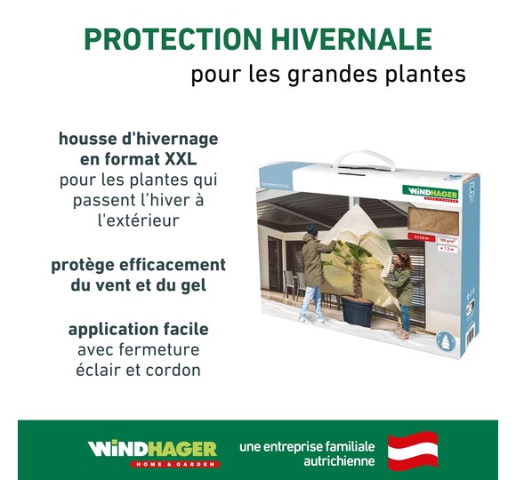 Ce n’est pas toujours simple de trouver la solution parfaite d’hivernage pour chaque plante. Le défi est d’autant plus grand que la plante est grosse. La bâche en non-tissé d’hivernage SUPERPROTECT XXL de Windhager est idéale pour protéger les plantes à la couronne large et buissonneuse contre l’assèchement et le gel, car elle résiste efficacement aux températures froides, au vent et au soleil d’hiver.