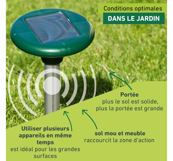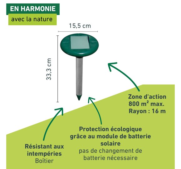 Les campagnols et les taupes peuvent causer de nombreux dégâts dans les jardins. L’appareil anti-taupes et campagnols SOLAR met fin à ce fléau – sans produits chimiques ni poison. L’appareil émet des ondes sonores à basse fréquence, à peine perceptibles par l’oreille humaine. Cependant, les espèces nuisibles perçoivent les sons comme extrêmement dérangeants et quittent donc la zone. En cas d’utilisation permanente, ils ne reviendront plus. L’appareil à fonctionnement solaire n’a pas besoin de câble et peut donc être utilisé de manière flexible et durable.