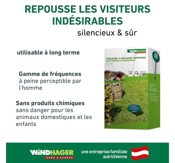Le Mole Stop 1000 a été le premier produit que Windhager a mis sur le marché – et il a toujours du succès, car il fonctionne ! Ainsi, la gamme de produits offre une grande variété de possibilités pour chasser les taupes et lutter contre les campagnols.