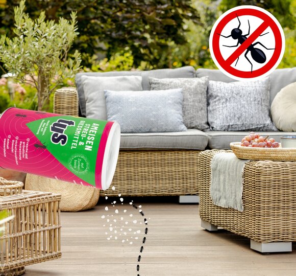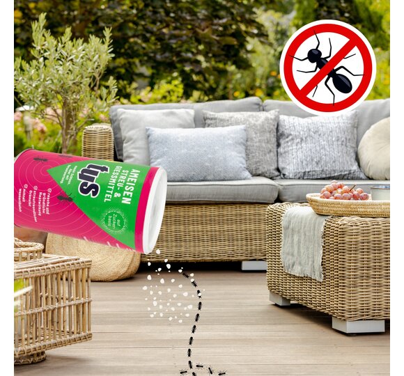 Ameisen auf der Terrasse oder rund ums Haus sind selten willkommene Gäste. Meist ist ein Nest im näheren Umfeld die Quelle allen Übels. Wird ein Ameisennest entdeckt, verschafft das Ameisen Streu- und Gießmittel von tus effektive Abhilfe.